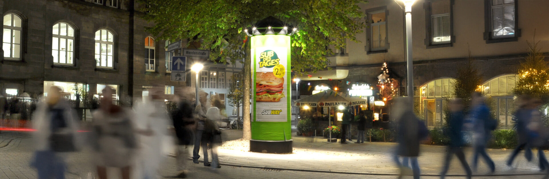 Ganzstellen – klassisch belegte Litfaßsäulen – gehören zu den auffälligsten Out-of-Home Medien im Stadtbild. Durch die runde Form und die 360°-Sichtbarkeit werden Passanten auf stark frequentierten Lauf- und Fahrwegen aus mehreren Blickrichtungen erreicht.